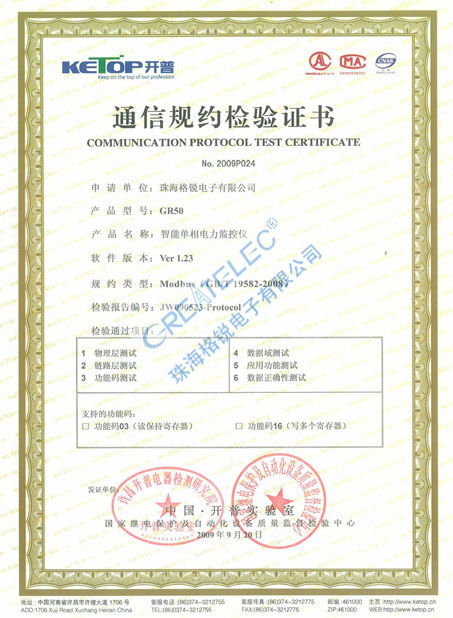 GR50通信規約檢驗證書--珠海格銳電子有限公司